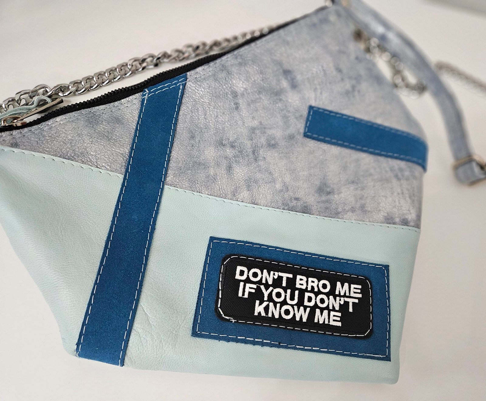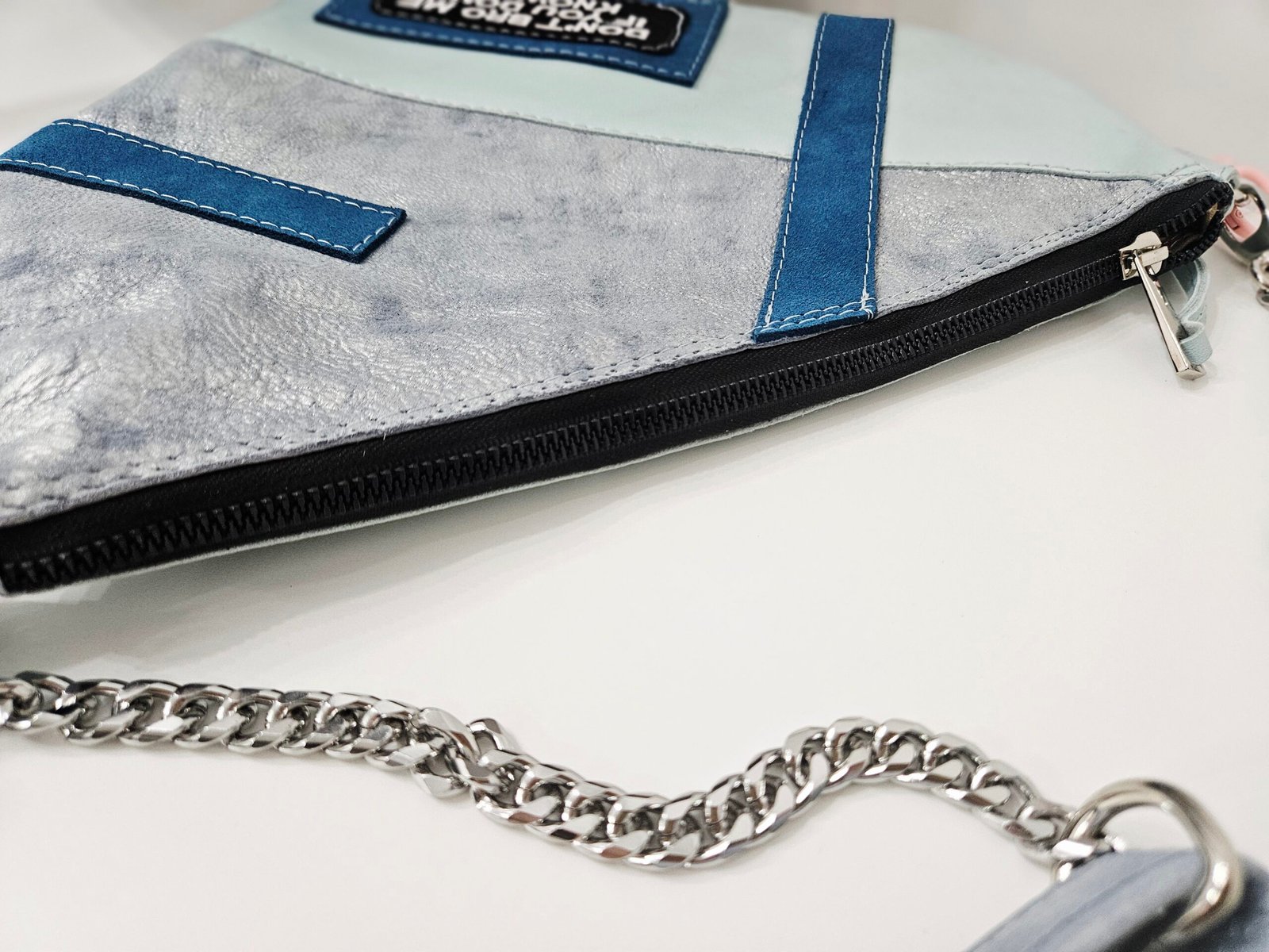 Ova torba dimenzije 30 cm x 25 cm spaja moderan dizajn, zanimljive teksture i upečatljive detalje u jedan izrazito nosiv i trendi modni dodatak. Izrađena je od kombinacije materijala u različitim nijansama plave i sive, što joj daje dinamiku i vizualnu dubinu. Metalni lanac, kvalitetni patentni zatvarač i dekorativni remen dodatno naglašavaju njezin suvremeni karakter. Torba je dovoljno kompaktna da bude praktična za svakodnevno nošenje, a istovremeno dovoljno efektna da podigne svaku odjevnu kombinaciju. Patchwork dizajn i statement detalji čine je idealnim izborom za žene koje vole unikatne modne dodatke i žele torbu koja se ističe, ali ostaje elegantna i funkcionalna. Bez obzira nosiš li je uz casual kombinaciju, poslovni outfit ili večernji look, ova torba donosi dozu osobnosti i modernog stila.