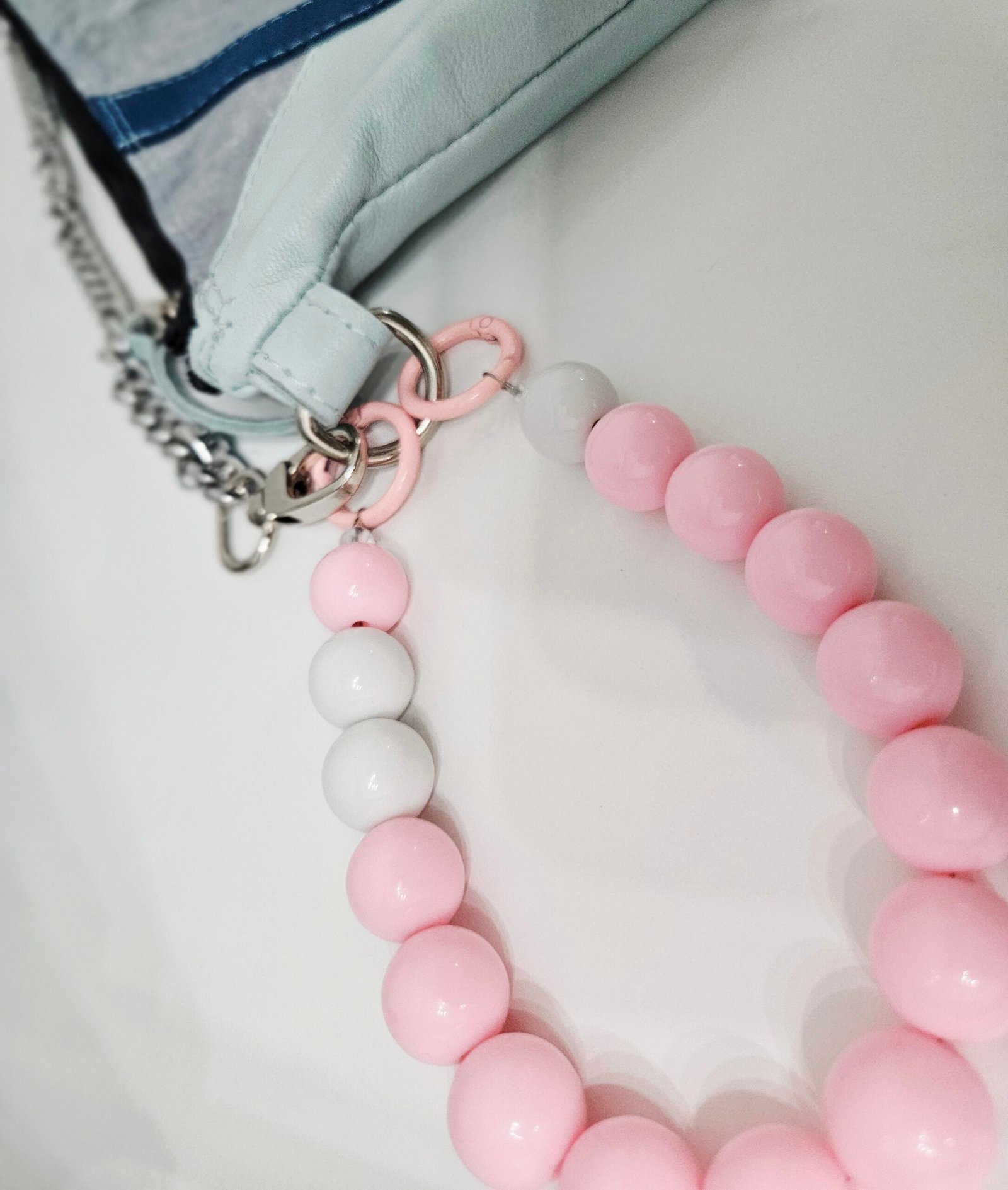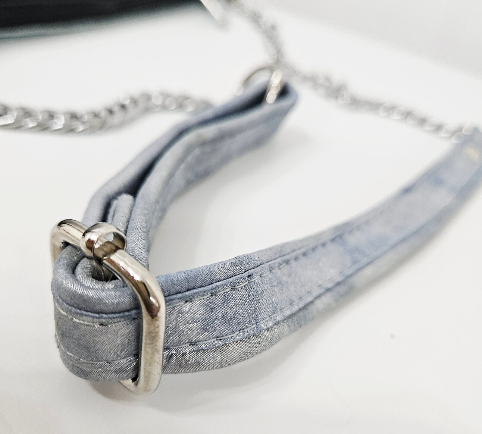 Moderna torba u plavim tonovima, izrađena od kombinacije tekstura i metalnih detalja. Dolazi s dekorativnim remenom i lancem, savršena za svakodnevni urbani stil.